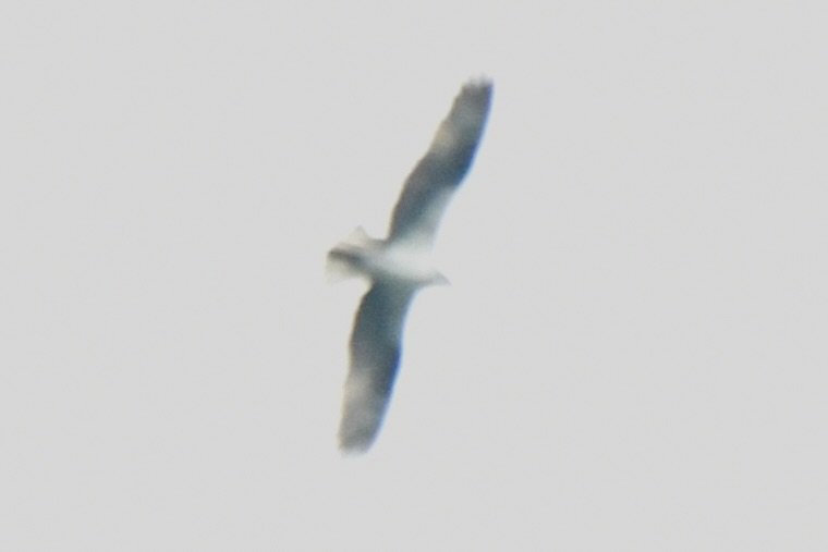 While I was looking around Woodcock Meadow, this bird flew over. I didn't have my camera set right, so the pictures are even worse than usual. I thought this was a Swainson's Hawk: White wing linings and underparts, long wings, short densely barred tail, hint of throat color and hood. But in fact it's an Osprey, just holding its wings out straight in migration.